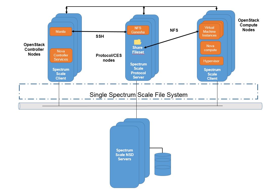 Spectrum Scale must be installed and a cluster must be created that includes one or more storage nodes and protocol server nodes. The NFS server running on these nodes is used to export shares to storage consumers in OpenStack virtual machines or even to bare metal storage consumers in the OpenStack environment. A file system must also be created and mounted on these nodes before configuring the manila service to use Spectrum Scale storage. For more details, refer to Spectrum Scale product documentation.
